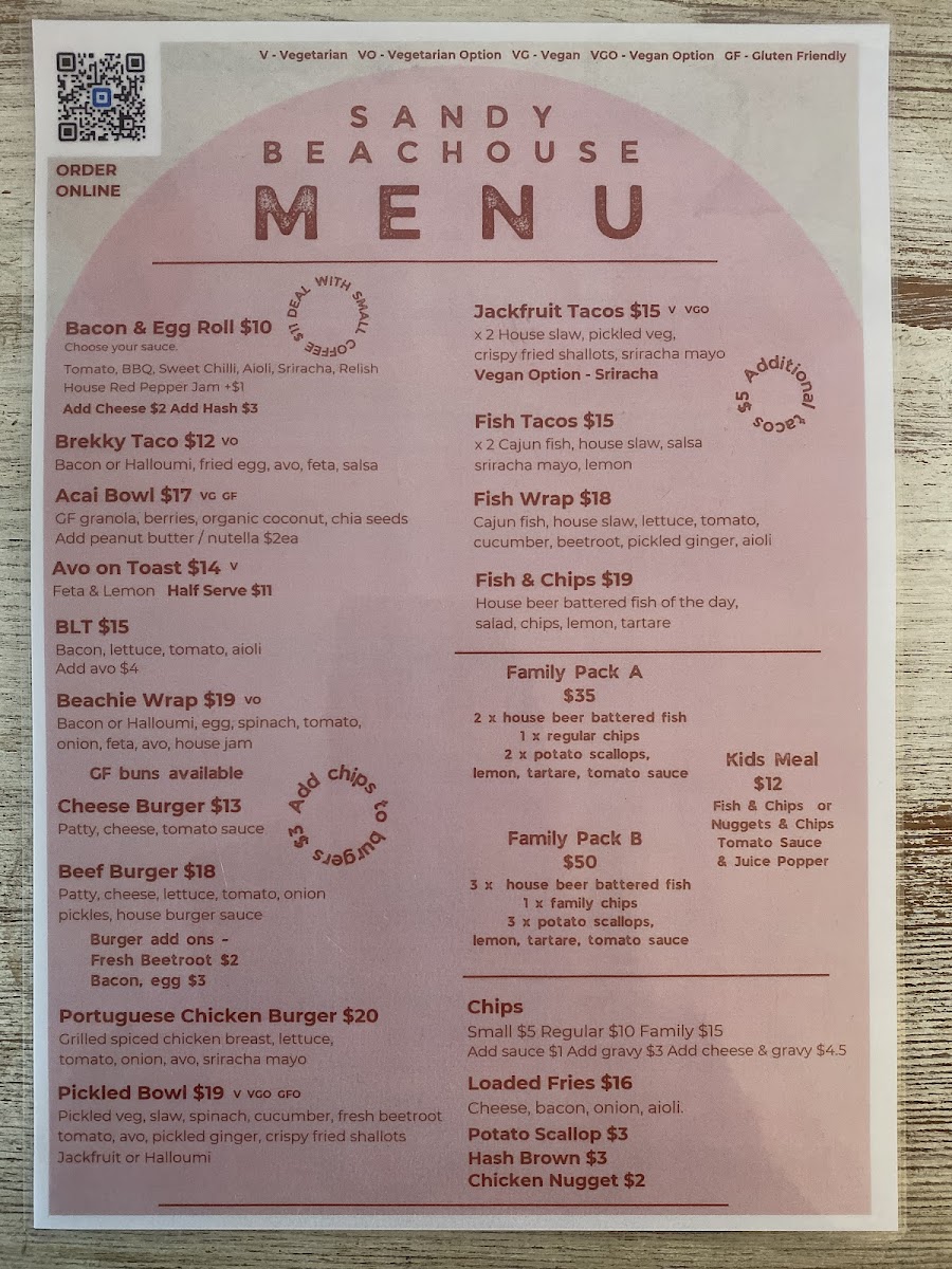 The menu at Sandy Beachouse offers a delightful range of breakfast and lunch options that are sure to please every palate. Start your day with their Bacon & Egg Roll, where you can personalize it with a choice of sauce ranging from classic tomato to zesty sriracha—all for just A$10.00. If you're in the mood for something a tad more adventurous, their Brekky Taco features a delicious mix of bacon or halloumi paired with a fried egg, avocado, feta, and vibrant salsa for A$12.00. Vegetarians will be thrilled with the Acai Bowl, bursting with berries, organic coconut, and crunchy granola at A$17.00. Each dish is crafted to satisfy, making it easy to see why customers rave about the generous servings that leave even the kiddos smiling.